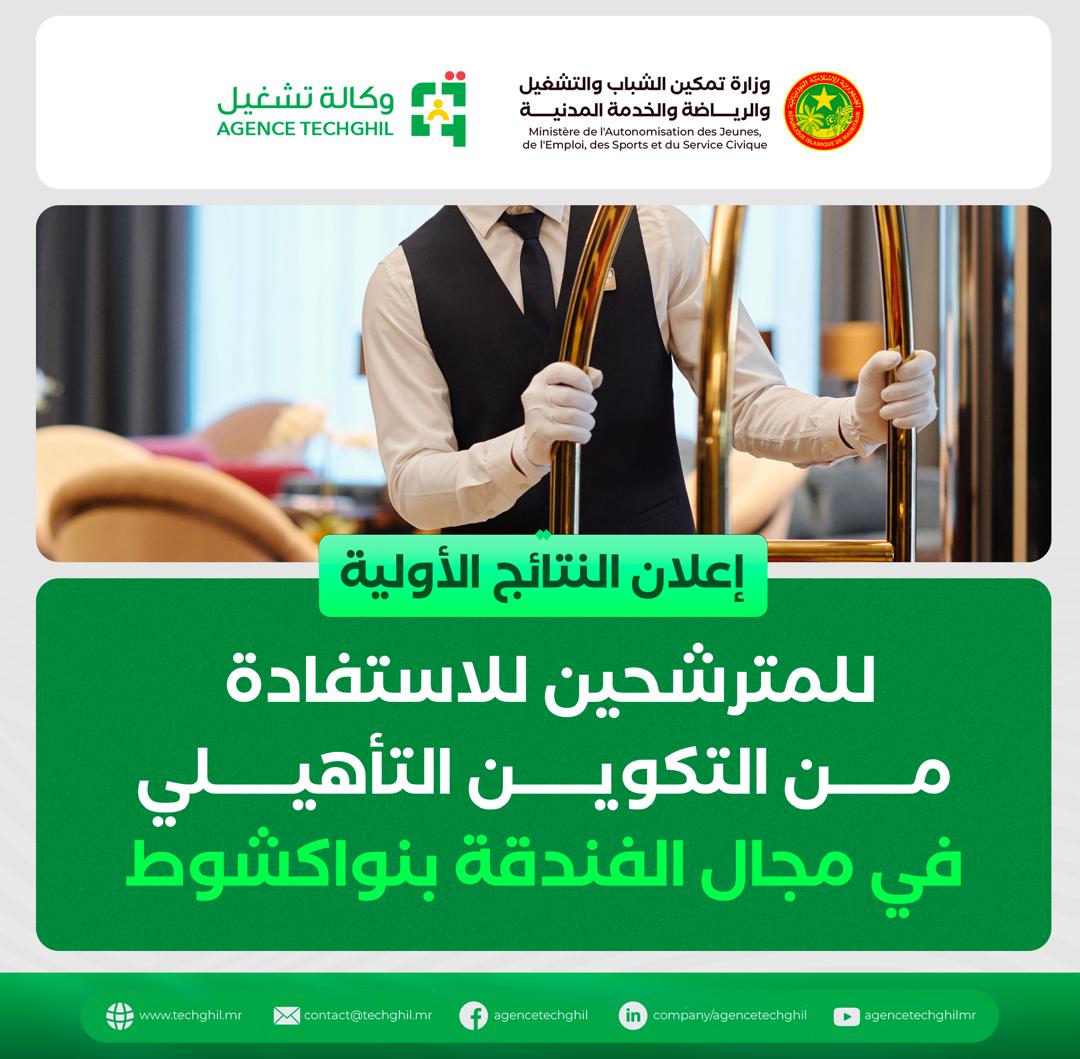 L’Agence Nationale pour l’Emploi (TECHGHIL) porte à la connaissance des candidats à la formation qualifiante dans le domaine de l’hôtellerie, qui sera organisée à Nouakchott, que, suite à la présélection automatique, une liste de 10 candidats a été retenue.