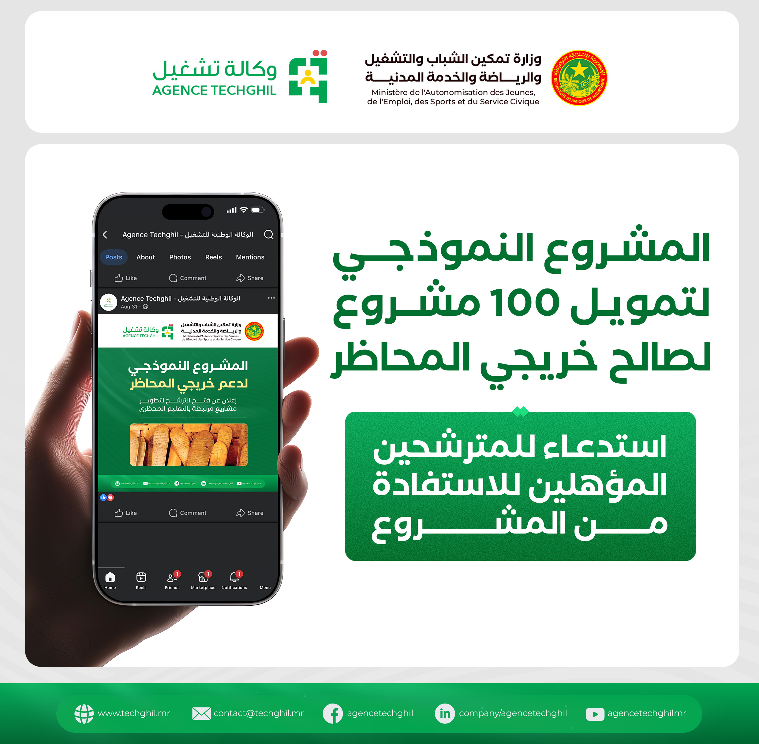 في إطار تنفيذ المشروع النموذجي لتمويل مشاريع لصالح خريجي المحاظر، تدعو الوكالة الوطنية للتشغيل المترشحين الذين تم اختيارهم ضمن لوائح المستفيدين، للمشاركة في البرنامج التكويني الممهد لإطلاق تمويل المشاريع.