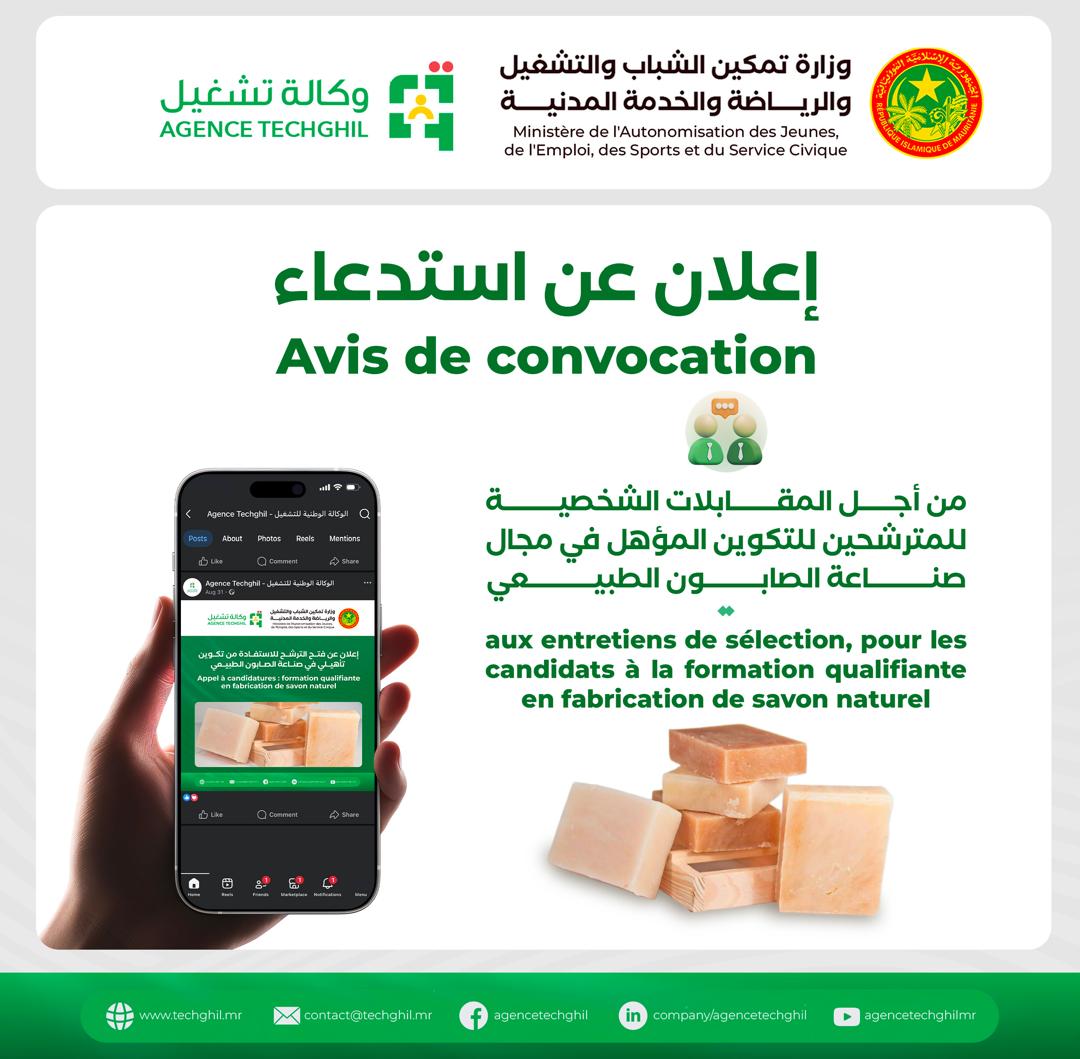 L’Agence Nationale pour l’Emploi (TECHGHIL) porte à la connaissance des candidats à la formation qualifiante en fabrication de savon naturel, que, suite à l’évaluation des candidatures soumises via le formulaire en ligne, les trente et un (31) candidats , dont les noms suivent, ont été présélectionnés pour passer les entretiens.