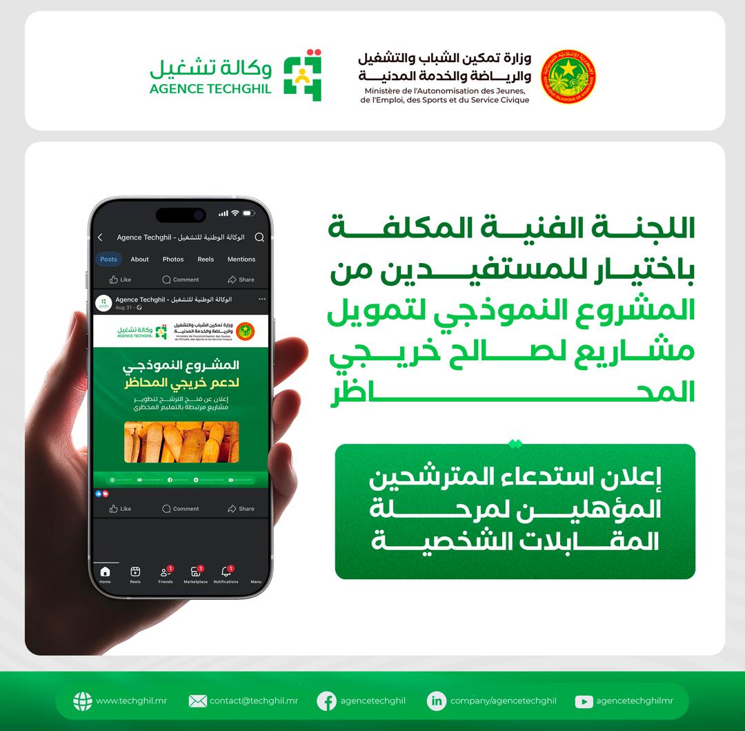 تدعو اللجنة الفنية المكلفة بالانتقاء الأولي للمترشحين للاستفادة من المشروع النموذجي لتمويل 100 مشروع لصالح خريجي المحاظر، المترشحين الذين اجتازوا مرحلة الانتقاء الأولي الأوتوماتيكي، إلى الحضور أمامها لإجراء مقابلات شخصية للتحقق من المعطيات التي صرحوا بها في استمارات الترشح وتم انتقاؤهم على أساسها.