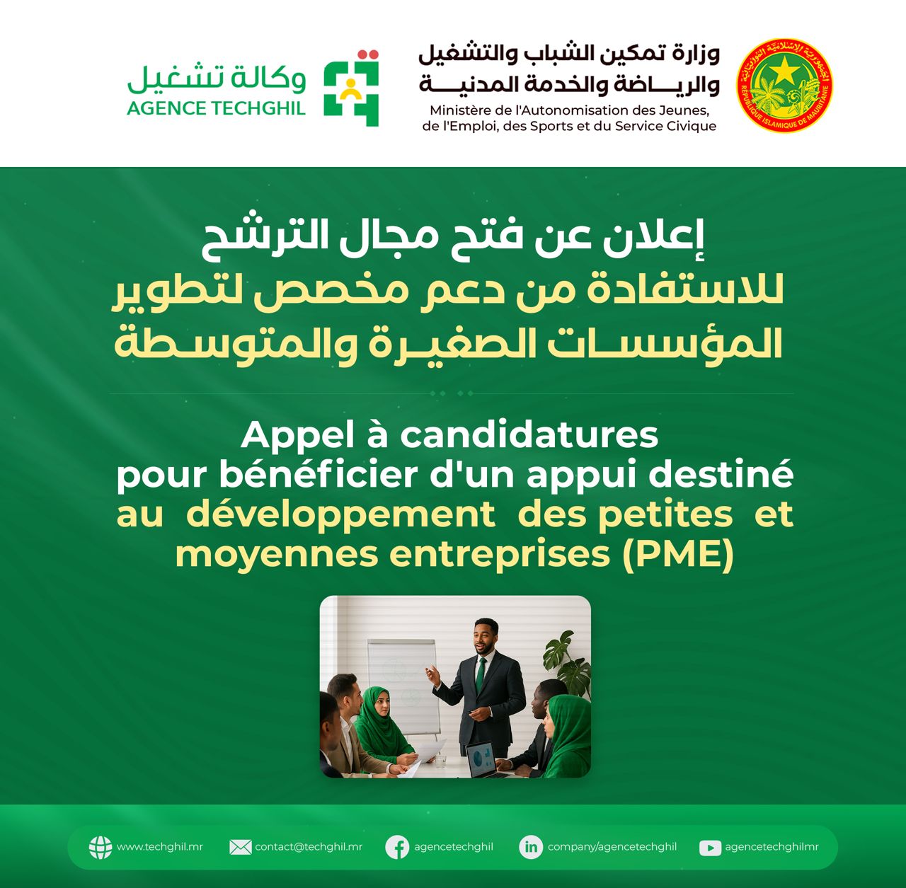 Le Guichet Entrepreneuriat, mis en place au sein de l’Agence Nationale pour l’Emploi (TECHGHIL) sous la tutelle du Ministère de l’Autonomisation des Jeunes, de l’Emploi, des Sports et du Service Civique, lance, dans le cadre de son opérationnalisation progressive, une action pilote destinée aux Petites et Moyennes Entreprises (PME).
