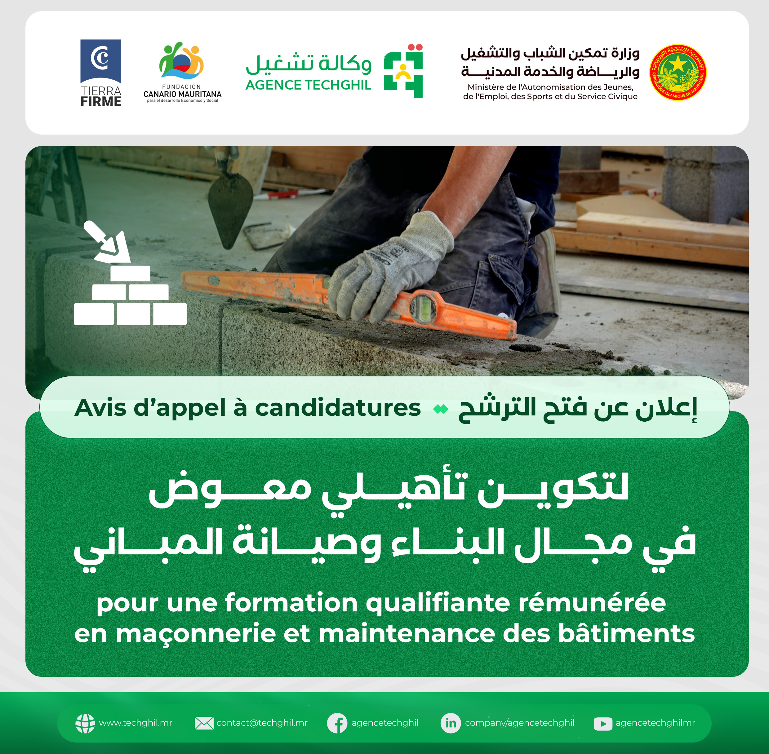 Dans le cadre du projet Tierra Firme, programme de formation professionnelle pour l’emploi, financé par le Gouvernement des Îles Canaries et mis en œuvre par la Fundación Laboral de la Construcción de Las Palmas (FLC), l’Agence Nationale pour l’Emploi (TECHGHIL), annonce le lancement d’un appel à candidatures, pour la sélection de 20 jeunes demandeurs d’emploi, souhaitant suivre une formation qualifiante en maçonnerie et maintenance des bâtiments.